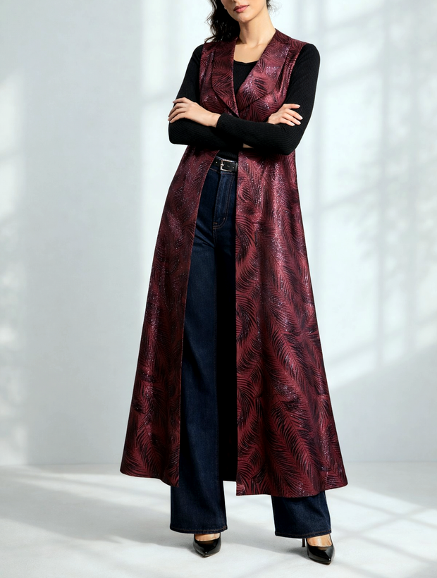 جلیقه زنانه ژاکارد زرشکی بلند با طرح شاخهای براق و یقه پهن، مدلی شیک و خاص برای استایل مجلسی و نیمهرسمی است. این جلیقه بلند با فرم آزاد و پارچه باکیفیت، جلوهای متفاوت و جذاب به استایل زنانه میدهد.